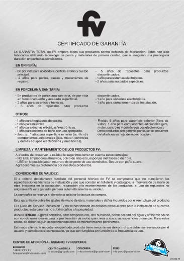 La GARANTIA TOTAL de FV, ampara todos sus productos contra defectos de fabricación. Estos han sido fabricados utilizando tecnología de punta y materiales de primera calidad, que le aseguran una prolongada duración en perfectas condiciones.